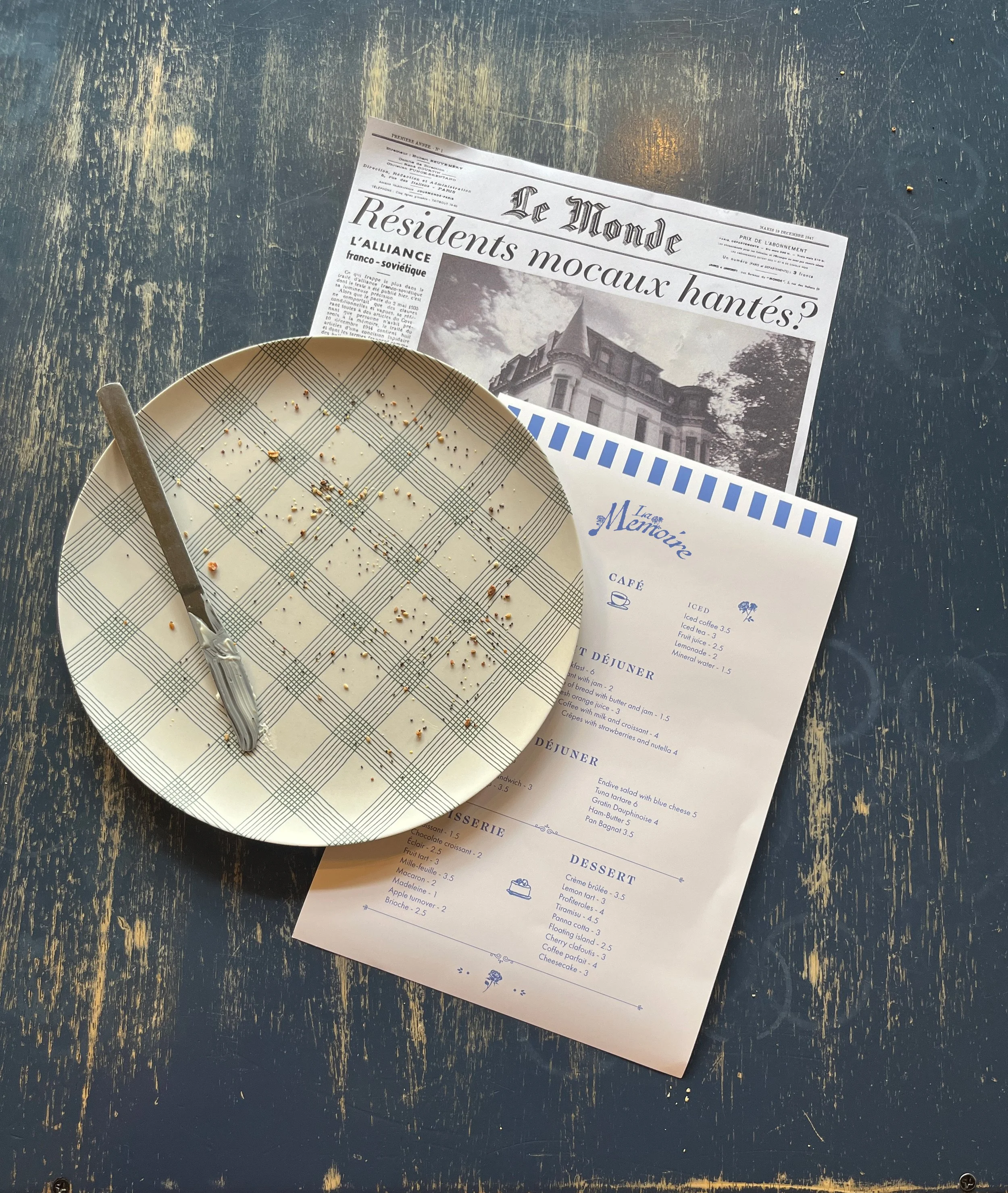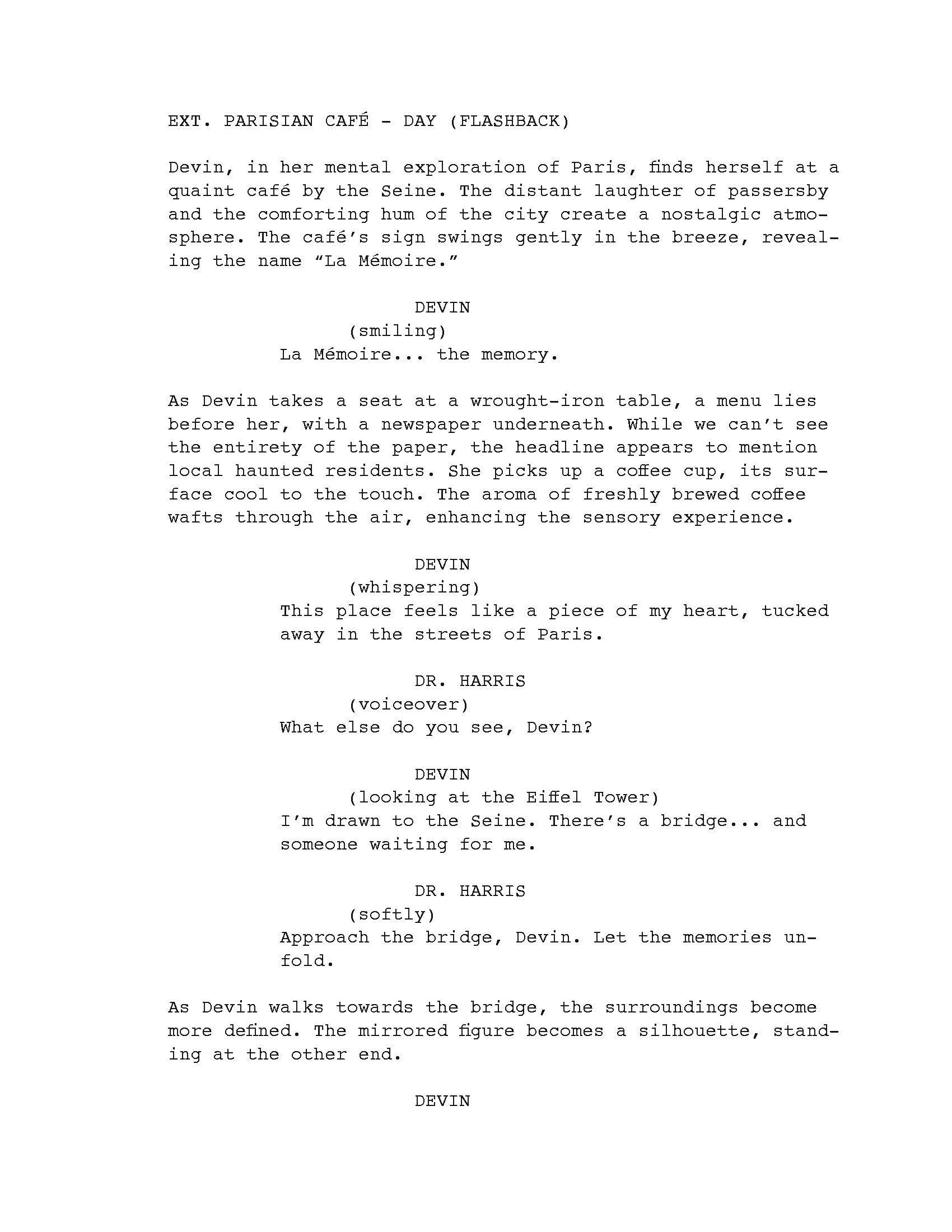 This set is inspired by the scene where Devon experiences a flashback to a Parisian café by the Seine. The script calls for a swinging sign for a cafe called “La Memoire” or, “The Memory”. I also included a glass signage option, and in this mockup I used generative AI to add flowers, decor and window details to the scene.