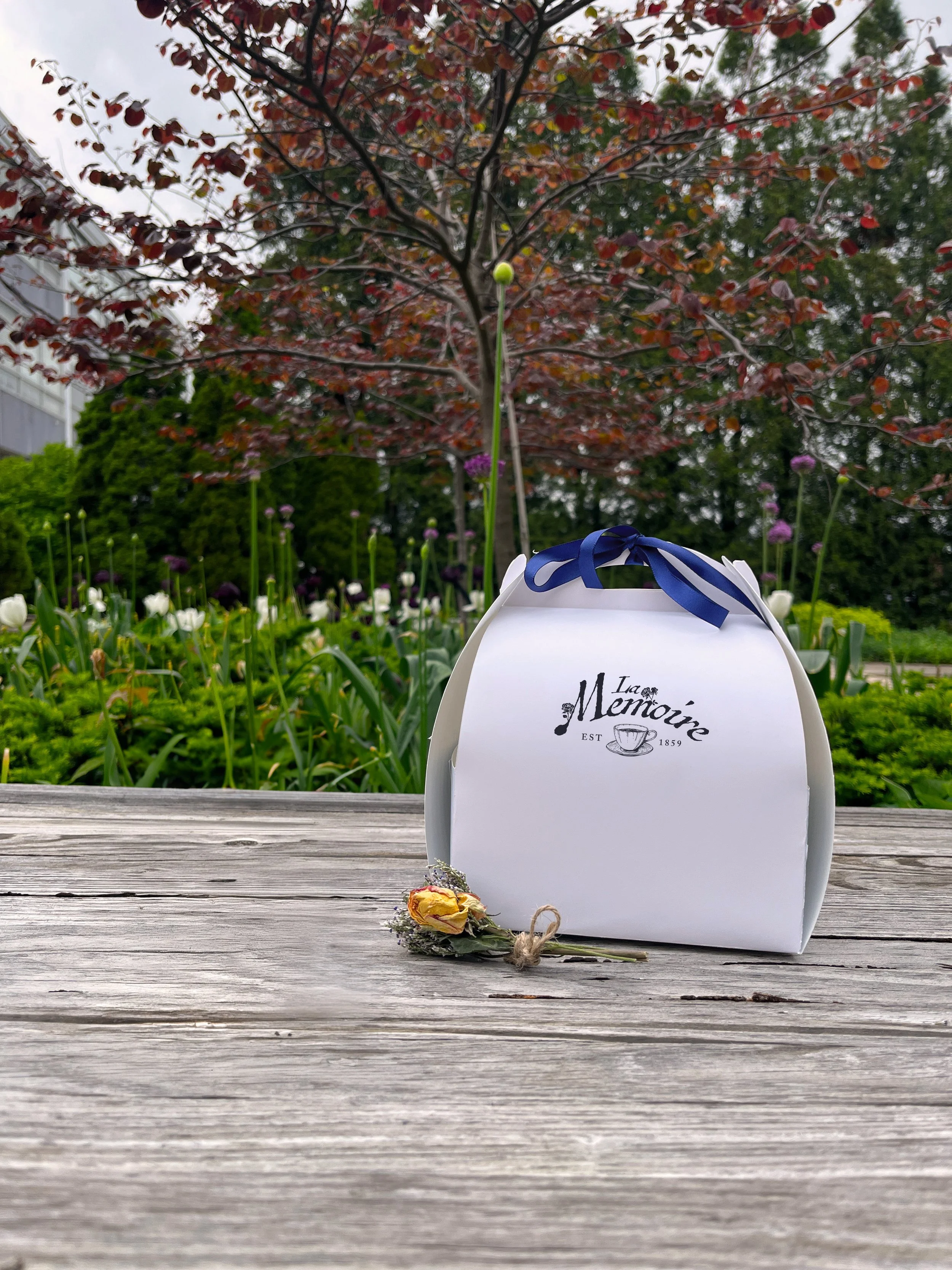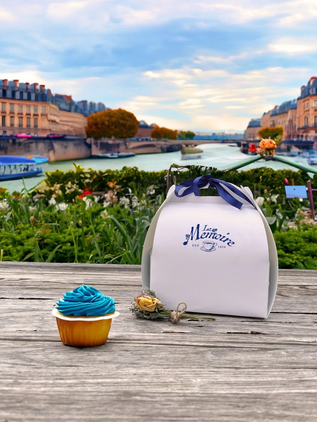 This is a Photoshop generative fill AI transformation. Left is a picture I took of the pastry box I printed and folded, and right is the output. I asked AI to “change the background to a view of the Seine”, and to “add a blue cupcake”.