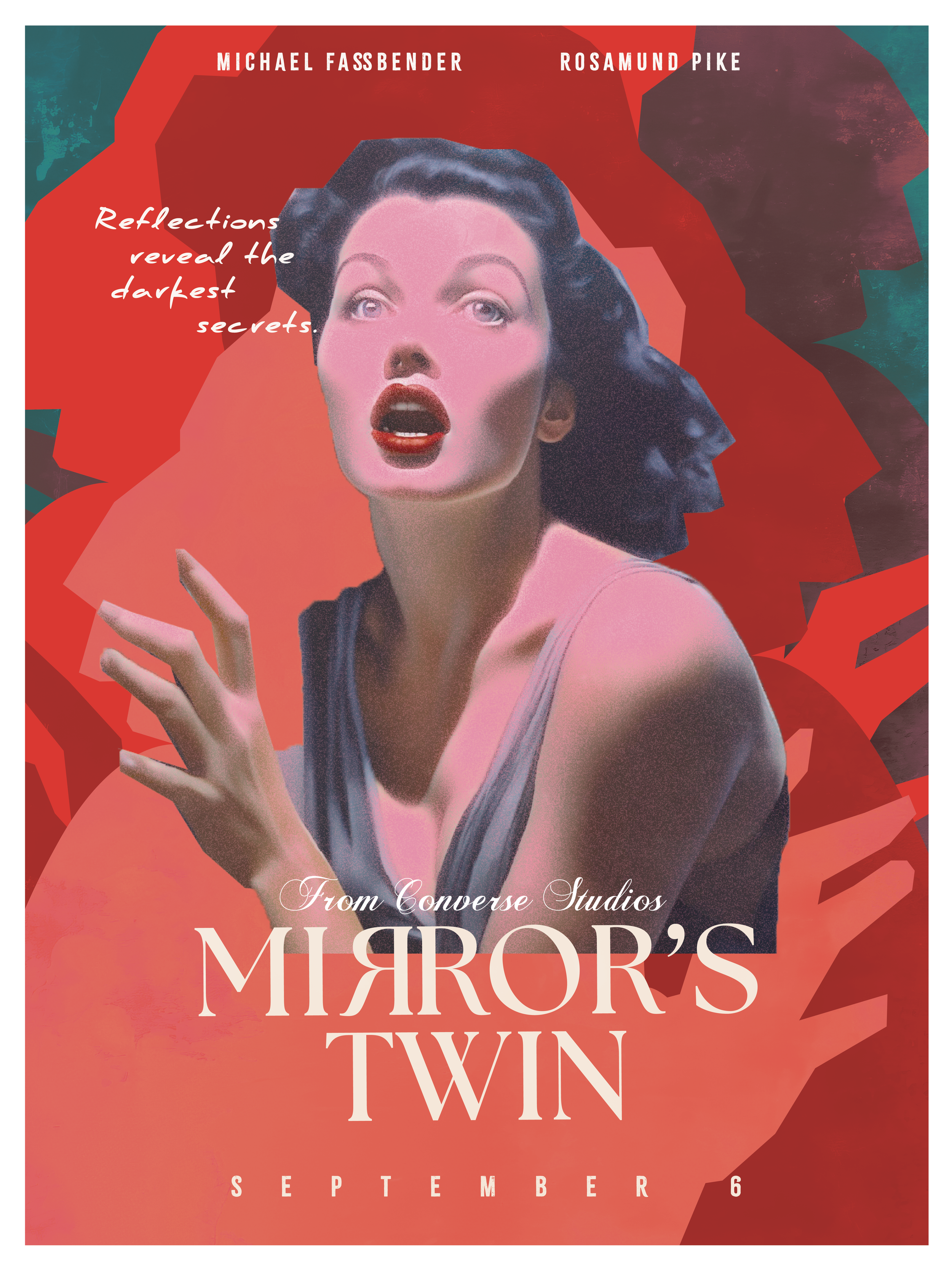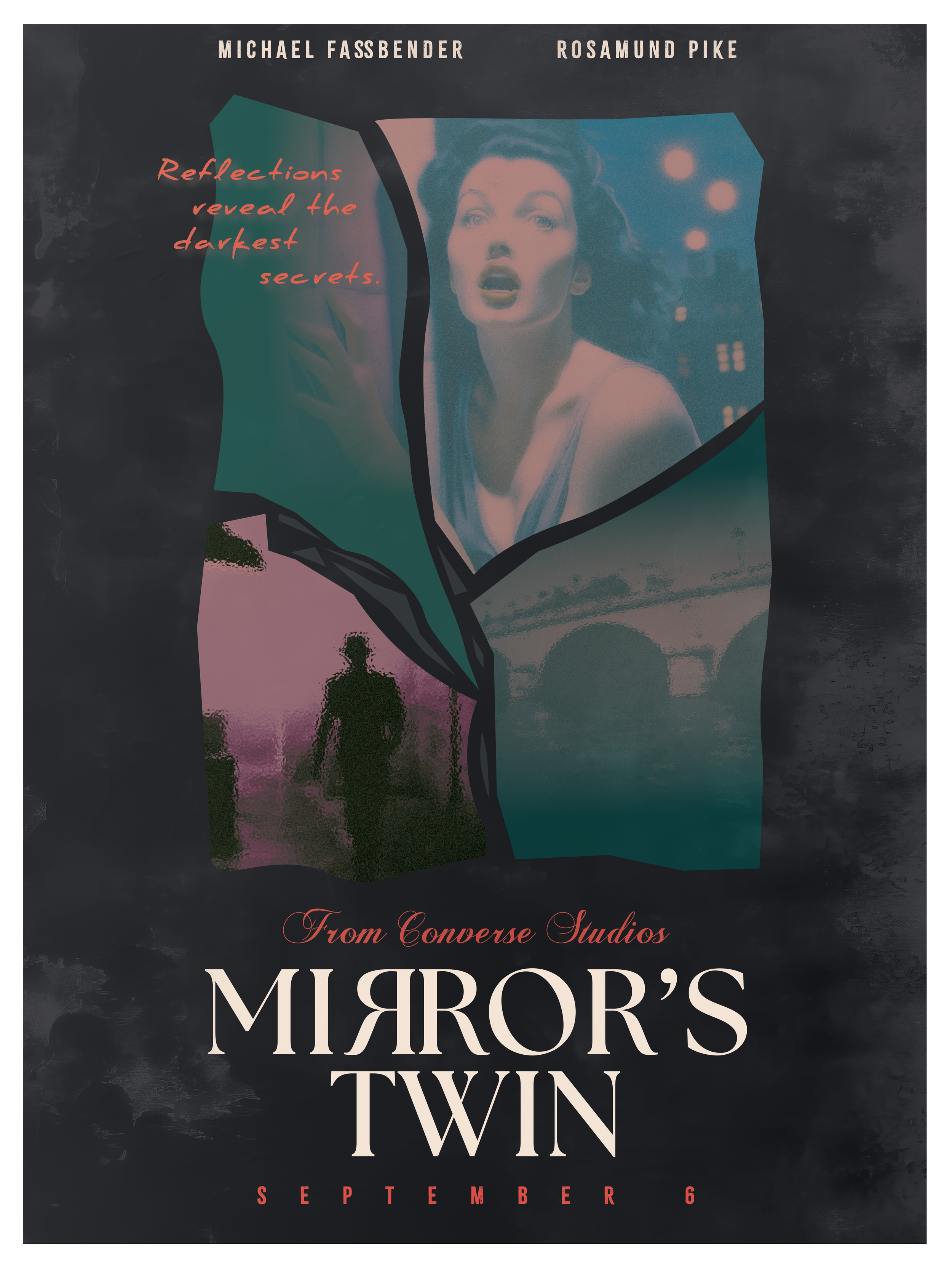 Project Overview: For a typography class, I was tasked to design graphics with an emphasis on expressive type for the thriller film Mirror's Twin, written by my professor in collaboration with ChatGPT. The project was intended to push us to apply our designs to real physical objects in print, as well as to get us thinking about staging and photography.