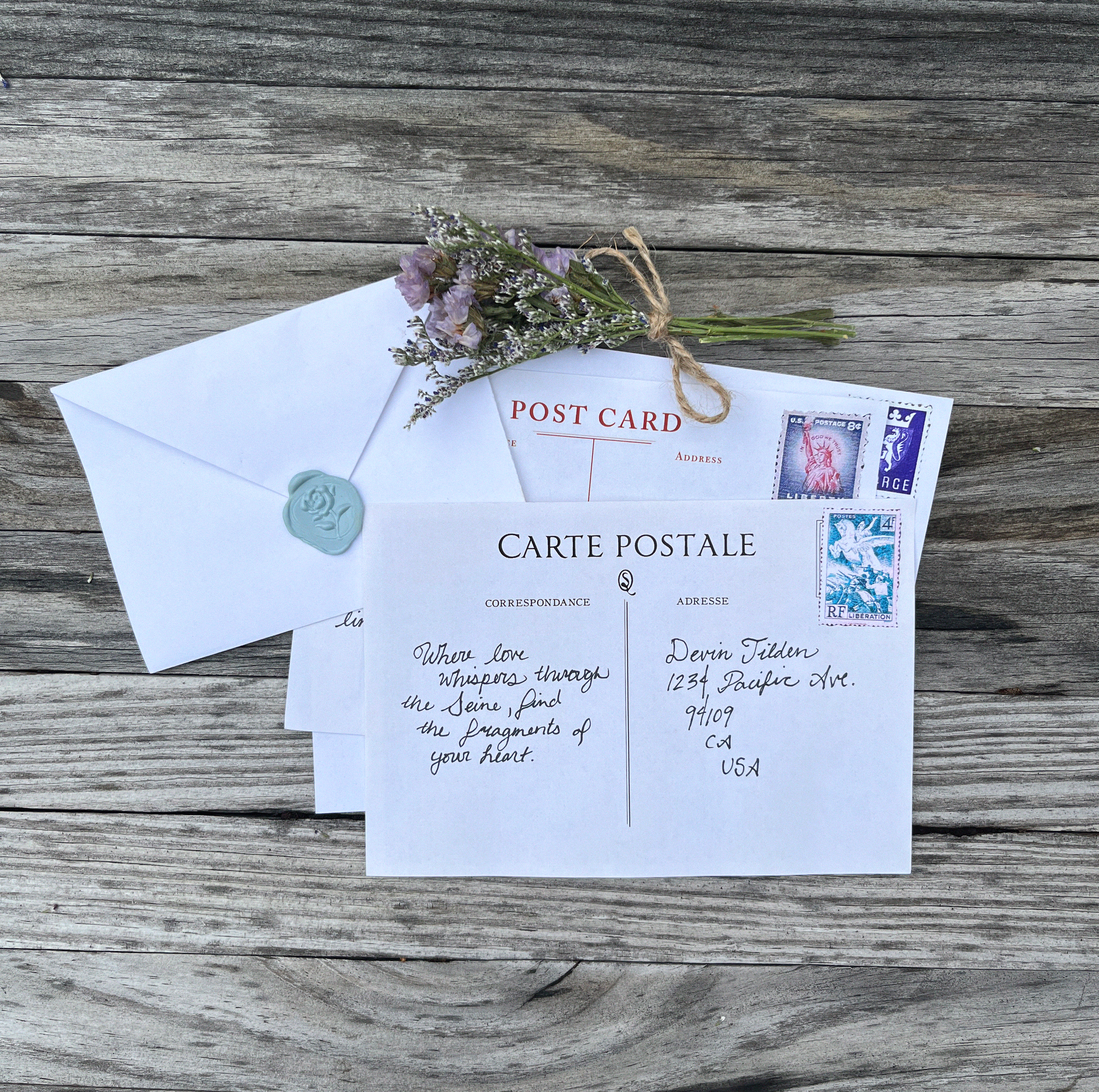 This shot of my postcard props illustrates a night time scene in Devin’s apartment in which she studies them intensely. Laying nearby the postcards is a tea light and matchstick, an opened lipstick (to be used in the scene), and, also from this mysterious sender of enigmatic verses about whispering-love, a sealed envelope with a blue rose on it. Inside is a pale blue rose petal.
